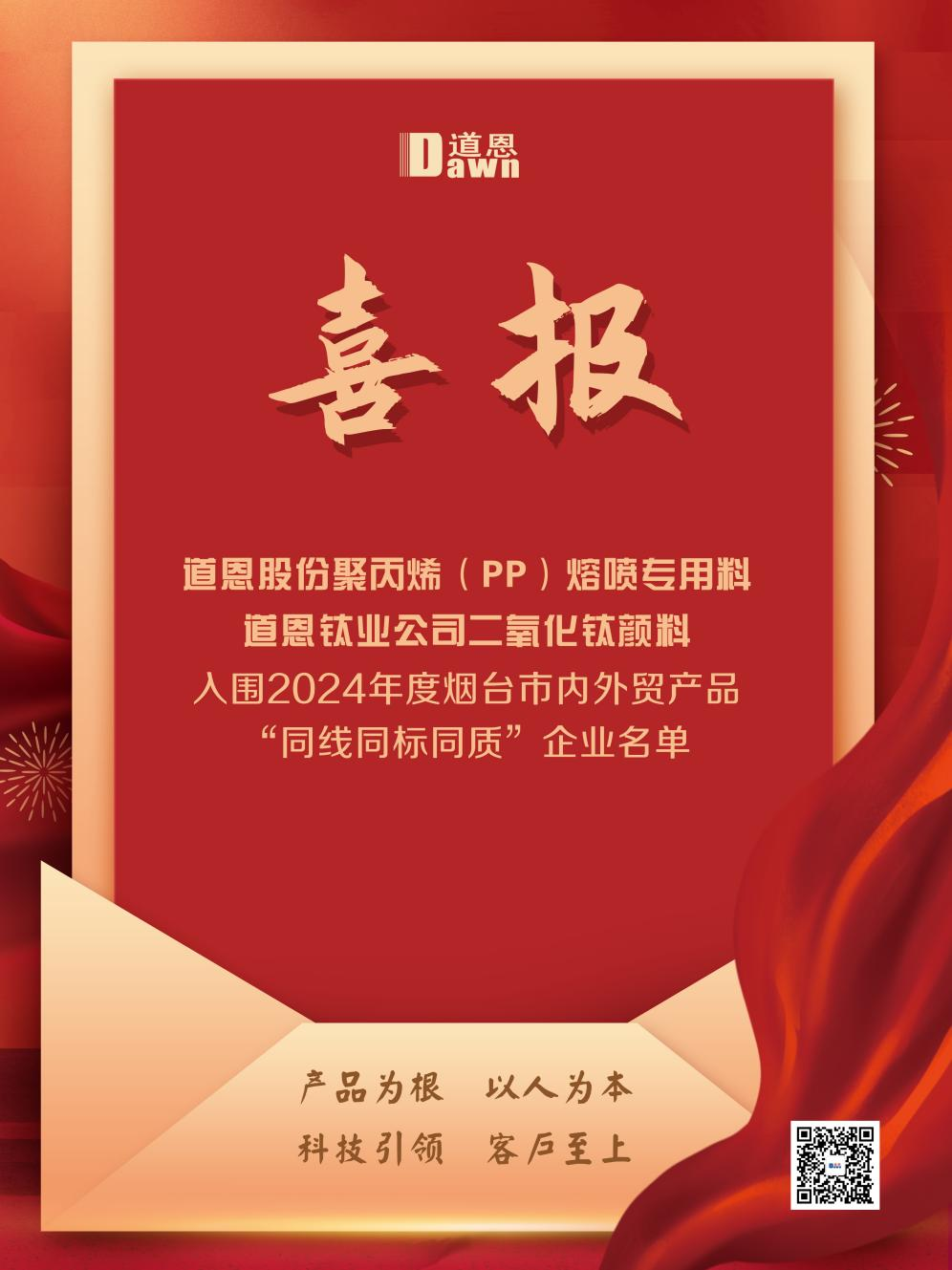 8月30日,煙臺市市場監督管理局、煙臺市商務局發布2024年度煙臺市內外貿產品“同線同標同質”企業名單,道恩股份的聚丙烯(PP)熔噴專用料、道恩鈦業公司的二氧化鈦顏料名列其中,是龍口市唯一入選該名單的企業。