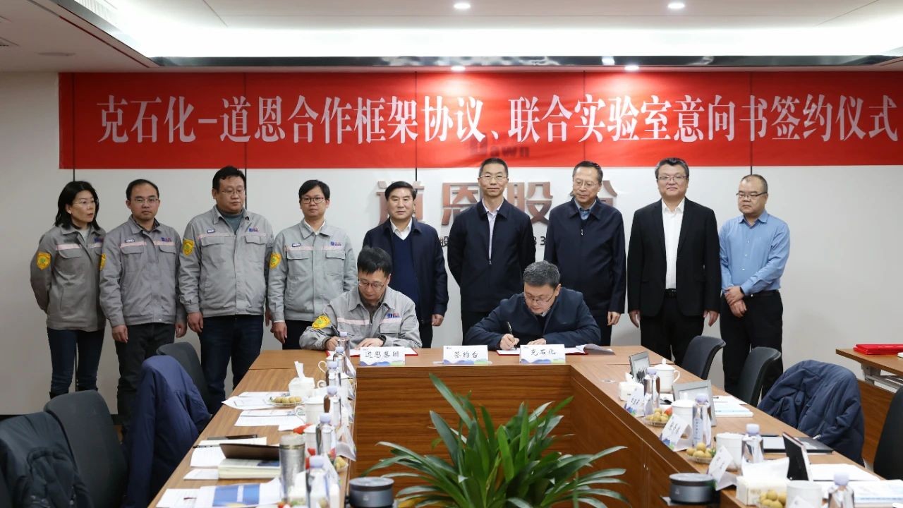 克石化副總經理鄺煜、煉油三部黨總支書記張景偉、營銷調運中心副主任劉杰、研究院副院長白生軍;道恩股份總經理田洪池,道恩集團研究院院長陳青葵,道恩股份母公司總經理王澤方、龍港股份董事長陳培倫、東朋自控總經理李建朋及有關部門負責人共同見證簽約和揭牌儀式。
