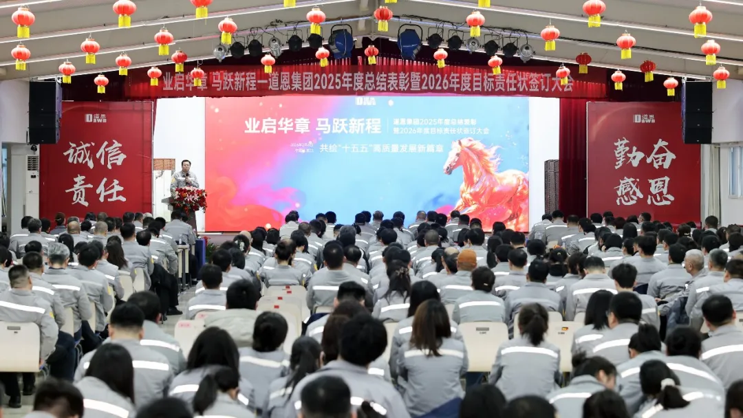 2月6日,道恩集團在道恩商學院召開主題為“業啟華章 馬躍新程”的2025年度總結表彰暨2026年度目標責任狀簽訂大會,旨在總結得失,研判形勢,表彰先進,激勵全體干部員工接續奮斗,推動企業健康發展、高質量發展。會議在山東龍口設主會場,在海內外設11個視頻分會場,道恩集團董事長、總裁于曉寧出席會議并講話。