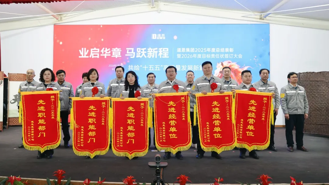 在下午召開的表彰大會上,道恩集團對2025年度作出突出貢獻的先進集體、先進個人進行表彰。與會領導為獲獎者頒發榮譽錦旗、榮譽證書及獎金。先進集體代表、先進個人代表先后登臺發言,傳遞奮進力量,表達了新一年度立足崗位、再創佳績的堅定決心。