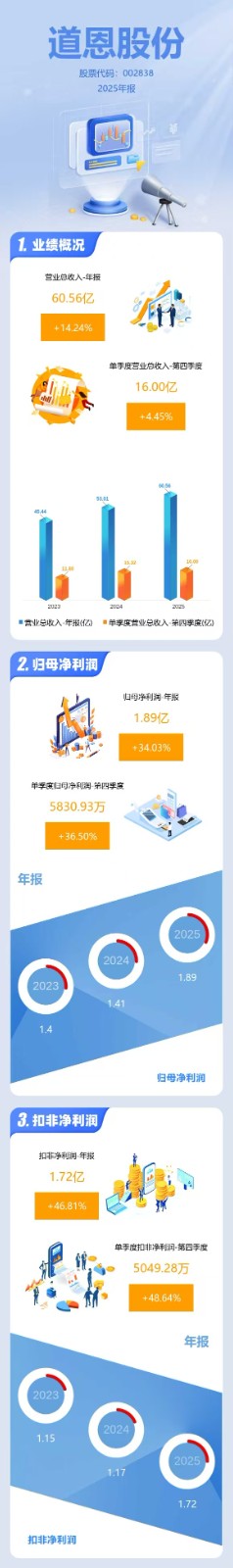 3月30日晚間,道恩股份(002838.SH)披露2025年年度報告。報告期內,公司產品銷量突破55.61萬噸,營業收入、歸屬上市公司股東凈利潤和扣除非經常性損益的凈利潤,分別同比增長14.25%、34.03%和46.82%,各項指標均創歷史新高,交出一份亮眼成績單,持續鞏固了道恩在高分子新材料行業的領先地位。