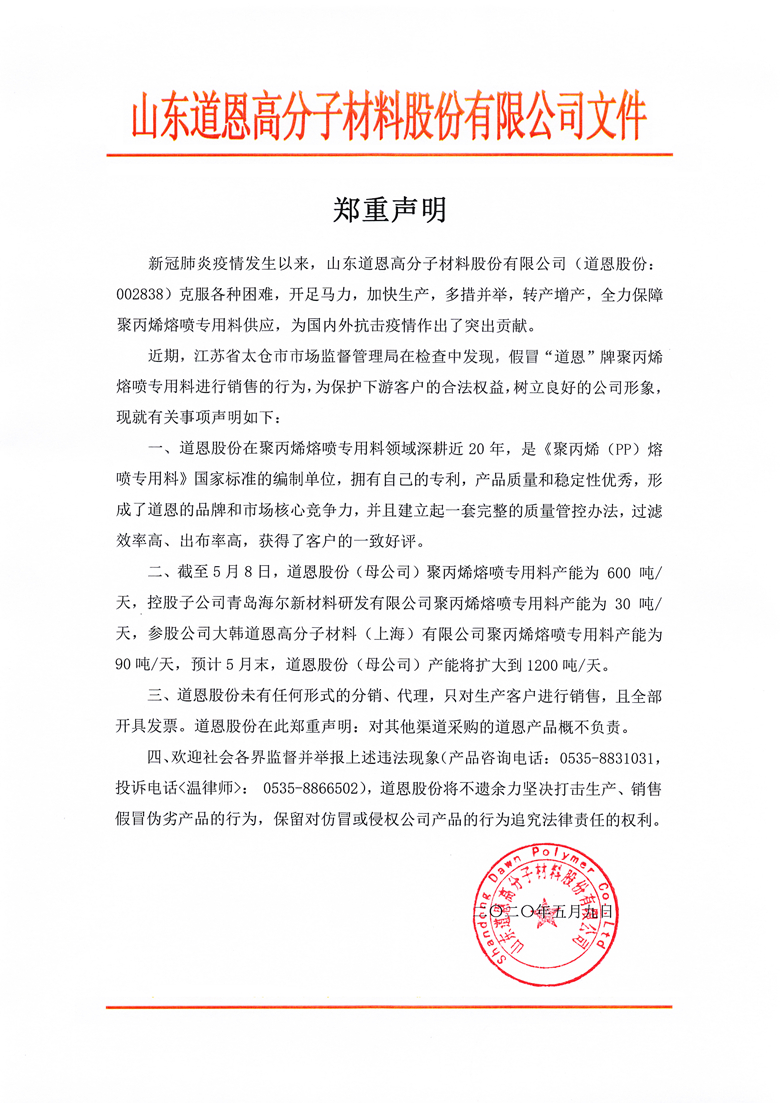 近期,江蘇省太倉市市場監督管理局在檢查中發現假冒“道恩”牌聚丙烯熔噴專用料進行銷售的行為,為保護下游客戶的合法權益,樹立良好的公司形象,現就有關事項聲明如下: