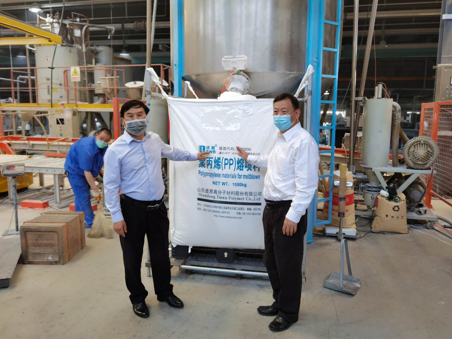 王強書記一行先后參觀了道恩股份一樓產(chǎn)品展廳、聚丙烯熔噴專用料車間,詳細了解口罩布聚丙烯熔噴專用料生產(chǎn)以及相關(guān)產(chǎn)業(yè)鏈情況。他高度贊揚了道恩保質(zhì)保量保供給的戰(zhàn)“疫”行動,并對道恩在疫情防控物資方面為中國石化提供的支持和幫助表示感謝。