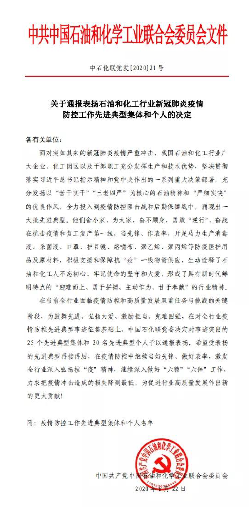 6月29日,中國石油和化學(xué)工業(yè)聯(lián)合會(huì)黨委舉辦“慶祝建黨99周年弘揚(yáng)行業(yè)抗疫精神視頻大會(huì)”,隆重紀(jì)念黨的99周歲生日,對(duì)45個(gè)石化行業(yè)抗疫先進(jìn)集體和個(gè)人進(jìn)行表彰,道恩集團(tuán)憑借在疫情期間的優(yōu)秀表現(xiàn)榮獲“石油和化工行業(yè)新冠肺炎疫情防控工作先進(jìn)典型集體”。
