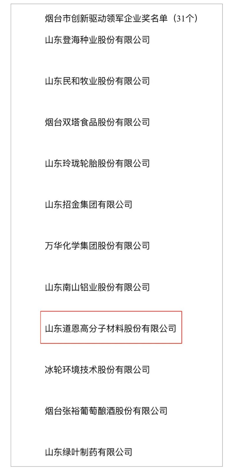 日前,煙臺市創新驅動發展獎評審委員會辦公室公布煙臺市創新驅動發展獎名單,道恩股份名列其中,成為煙臺市創新驅動領軍企業。