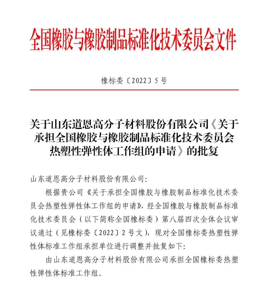 3月14日,山東道恩高分子材料股份有限公司(簡稱道恩股份)《關(guān)于承擔(dān)全國橡膠與橡膠制品標(biāo)準(zhǔn)化技術(shù)委員會熱塑性彈性體工作組的申請》,獲得全國橡膠與橡膠制品標(biāo)準(zhǔn)化技術(shù)委員會(簡稱全國橡標(biāo)委)正式批復(fù)。此舉標(biāo)志著這一全國標(biāo)準(zhǔn)化工作組落戶道恩,將有利于貫徹落實國家標(biāo)準(zhǔn)化工作的方針政策,提高熱塑性彈性體領(lǐng)域標(biāo)準(zhǔn)化水平和行業(yè)競爭力。