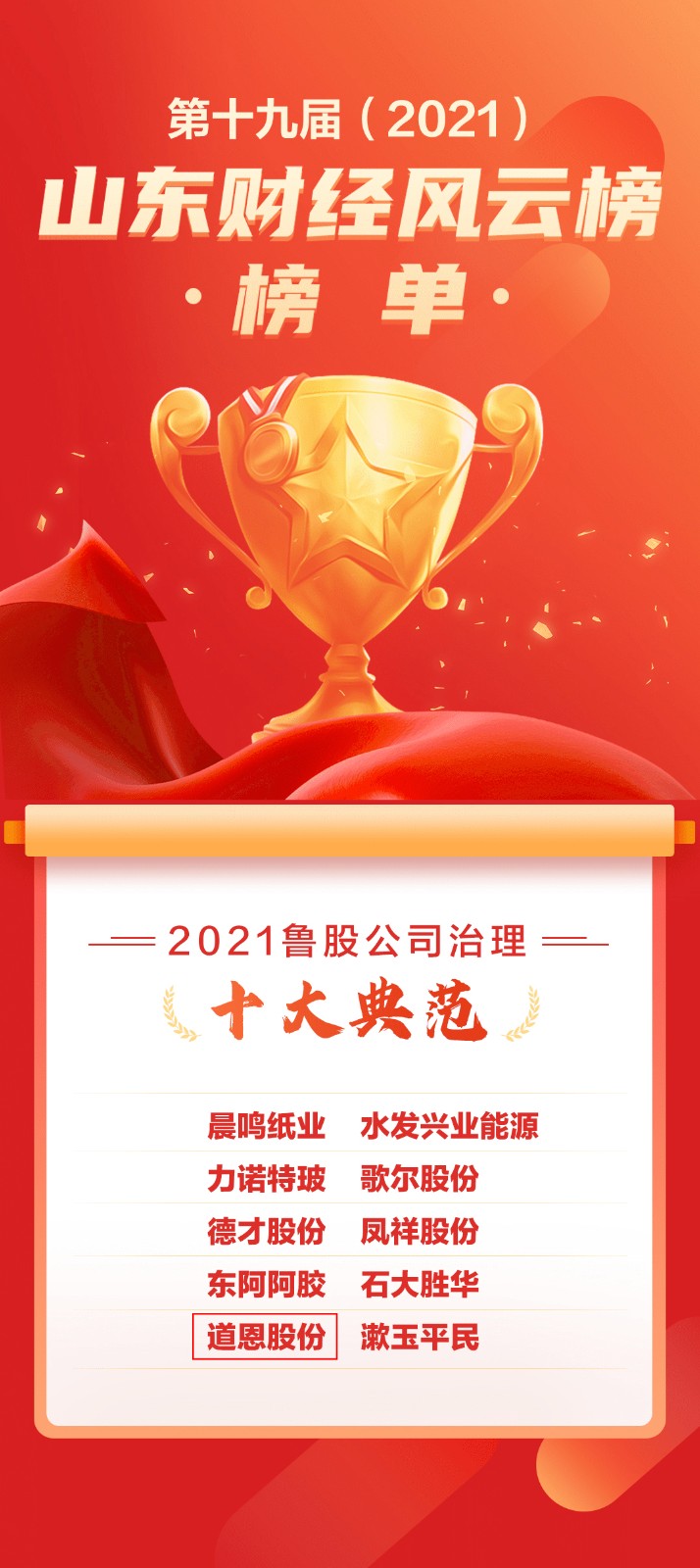 6月28日下午,“奮力走在前——第十九屆(2021)山東財經(jīng)風(fēng)云榜”頒獎盛典在濟(jì)南舉行。道恩股份榮獲“2021山東財經(jīng)風(fēng)云榜魯股公司治理十大典范”。