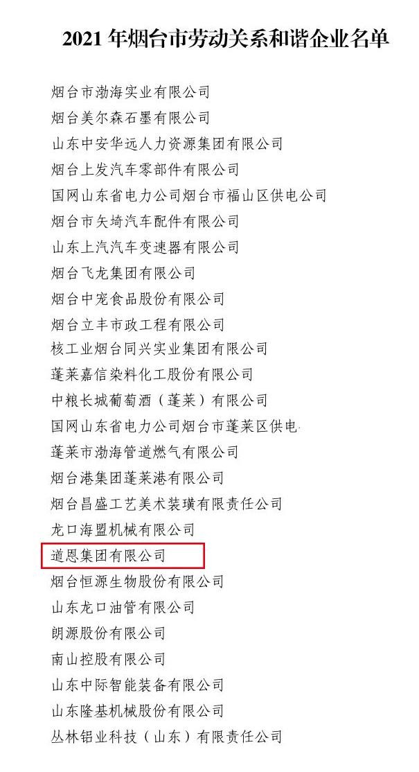 8月2日,煙臺市公布2021年度煙臺市勞動關系和諧企業、煙臺市勞動關系和諧工業園區名單,道恩集團榜上有名,榮獲“煙臺市勞動關系和諧企業”稱號。據悉,道恩集團所在的龍口經濟開發區榮獲“煙臺市勞動關系和諧工業園區”稱號。
