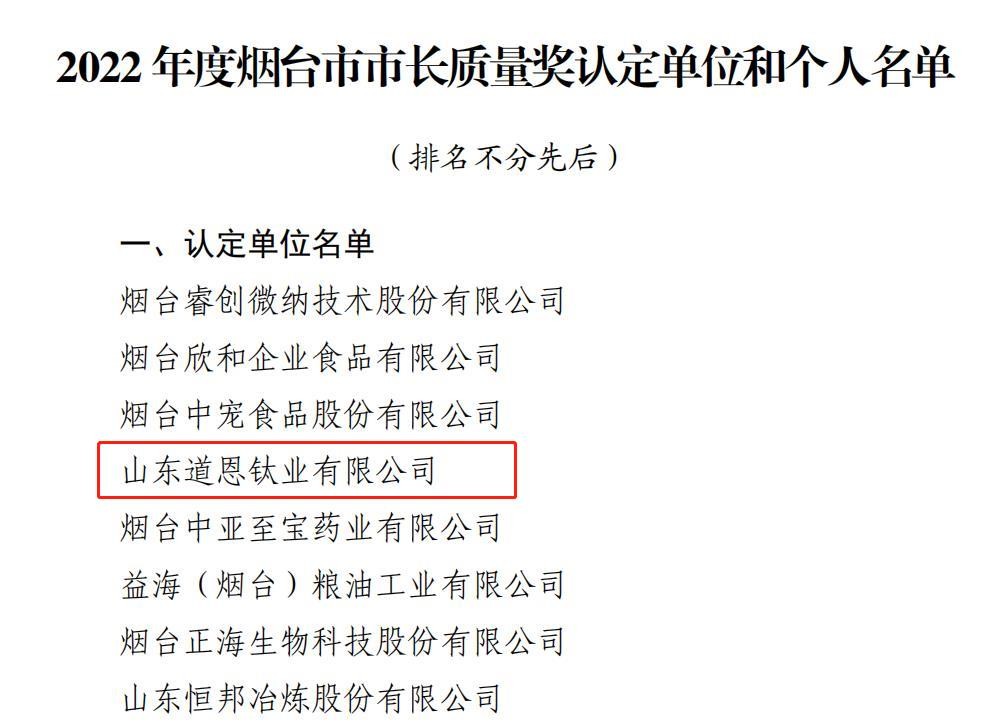 11月4日,煙臺市公布了2022年市長質(zhì)量獎獲獎名單,全市共8家企業(yè)上榜,道恩鈦業(yè)公司榜上有名。據(jù)悉,這是繼道恩股份之后,道恩集團再添一家市長質(zhì)量獎獲獎企業(yè),也是龍口市本次唯一獲此殊榮的企業(yè)。