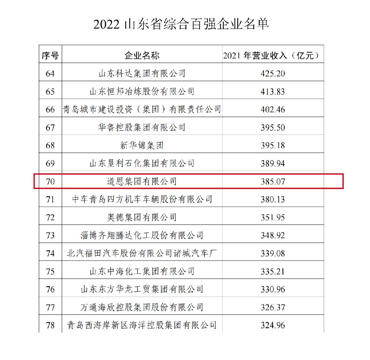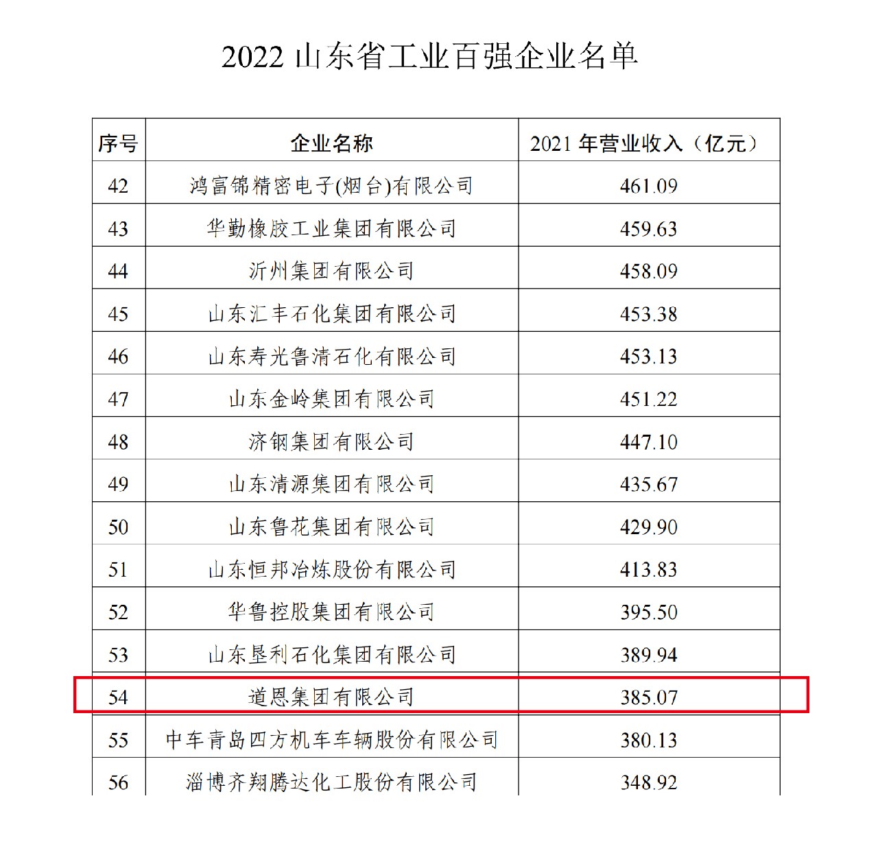 近日,山東省工業(yè)和信息化廳、山東省企業(yè)聯(lián)合會(huì)公布2022山東企業(yè)百?gòu)?qiáng)名單,道恩集團(tuán)入選綜合百?gòu)?qiáng)企業(yè)第70名和工業(yè)百?gòu)?qiáng)企業(yè)第54名。