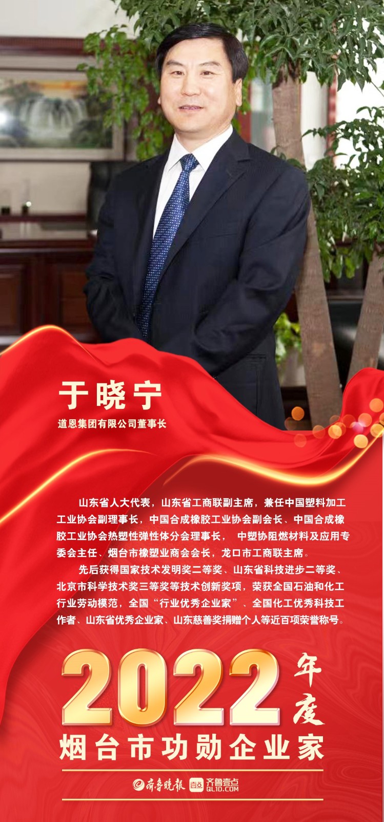 5月17日上午,煙臺市召開全市2022年工作總結(jié)暨優(yōu)秀企業(yè)家表彰大會,旨在深入落實全省加力提速工業(yè)經(jīng)濟高質(zhì)量發(fā)展大會精神,鼓勵全市廣大企業(yè)家提振精氣神、再創(chuàng)新佳績、作出新貢獻。會上,道恩集團董事長、總裁于曉寧被授予“2022年度煙臺市功勛企業(yè)家”稱號。據(jù)悉,這是于曉寧董事長連續(xù)三年獲此殊榮。