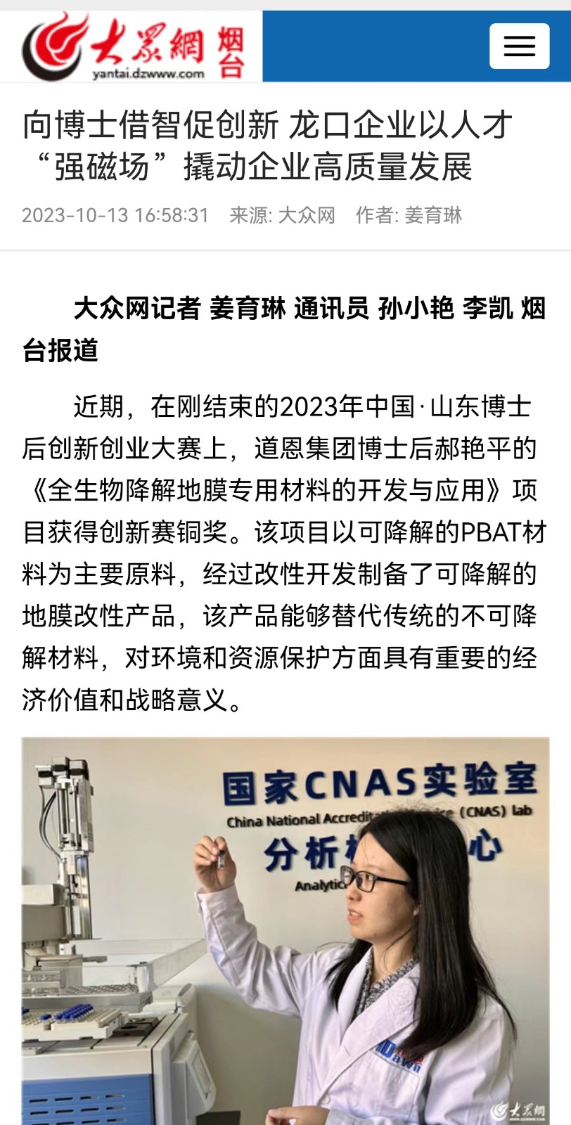 此前的9月18日,2023年中國·山東博士后創(chuàng)新創(chuàng)業(yè)大賽頒獎典禮在山東省青島市舉行。道恩集團(tuán)在站博士后郝艷平站上了領(lǐng)獎臺,她主持的“全生物降解地膜專用材料的開發(fā)與應(yīng)用”項目獲得了創(chuàng)新賽銅獎。據(jù)悉,這是龍口市唯一獲獎的博士后工作站項目。