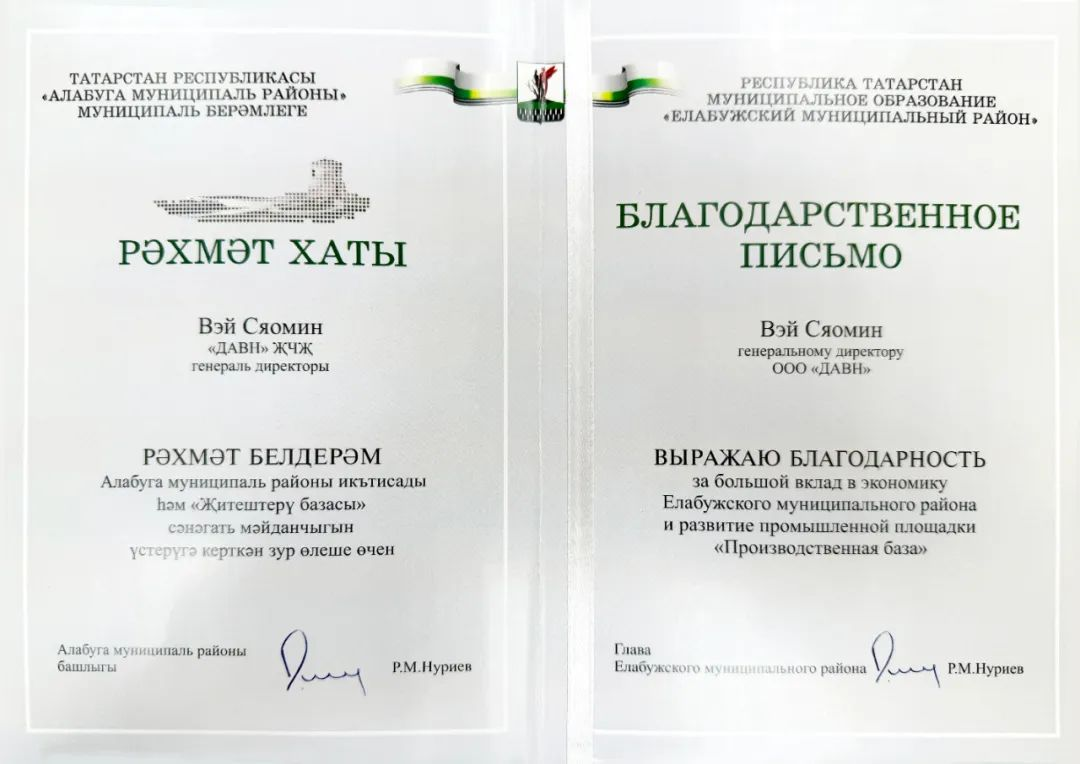 “感謝貴公司為葉拉布加市及葉拉布加工業區的經濟發展和進步作出了重大貢獻。”1024日,在韃靼斯坦共和國葉拉布加市舉行的年度經濟發展交流會上,該市市長盧列夫·魯斯塔姆為道恩英德爾有限責任公司頒發的致謝信,如是評價道恩在俄羅斯工廠突出的表現。