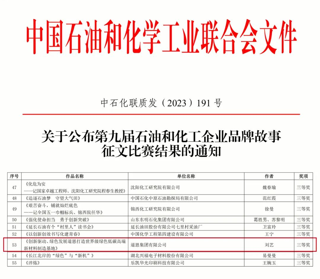 10月27日,中國石油和化學工業聯合會發布第九屆石油和化工企業品牌故事征文比賽獲獎名單,道恩集團參賽的文稿類作品《創新驅動、綠色發展,道恩打造世界級綠色低碳高端新材料制造基地》榮獲三等獎。