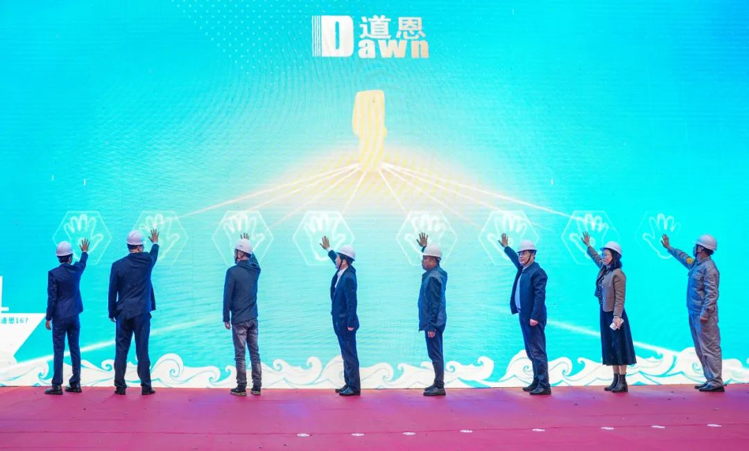 當天上午,“道恩167”輪上水儀式在浙江寧波象山隆重舉行。寧波振鶴船業有限公司董事長嚴林華、總經理嚴雪保及團隊成員,中國船級社寧波分社建造處處長俞建超、大片區區長林杰及團隊成員,浙江欣海船舶設計院股份有限公司團隊成員;道恩集團董事長、總裁于曉寧,投資管理委員會副主任韓麗梅,副總裁解云濤,道恩國際物流公司總經理韓永衛及團隊成員出席活動,共同見證這一歷史性時刻。